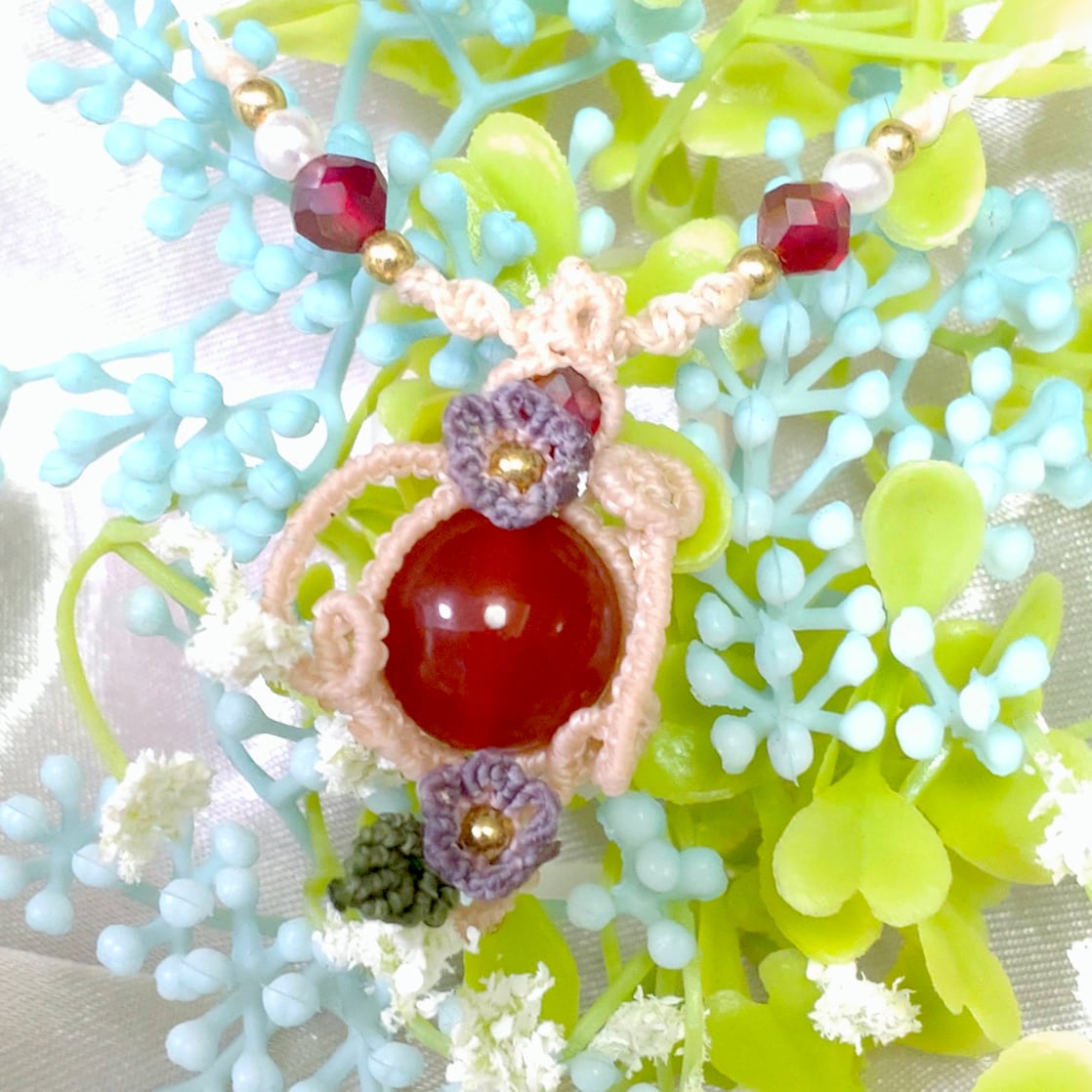 真っ赤な果実のような赤メノウをメインにアイボリーの糸で結びました。